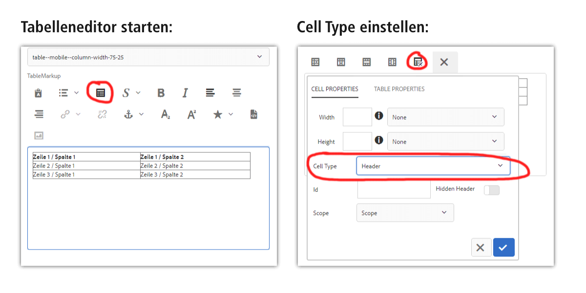 * bei direkter Einbindung ist das Layout „centered text” nicht verfügbar –daher bietet es sich meist eher an, das Tabellenmodul mit Hilfe des Textmoduls einzubinden.