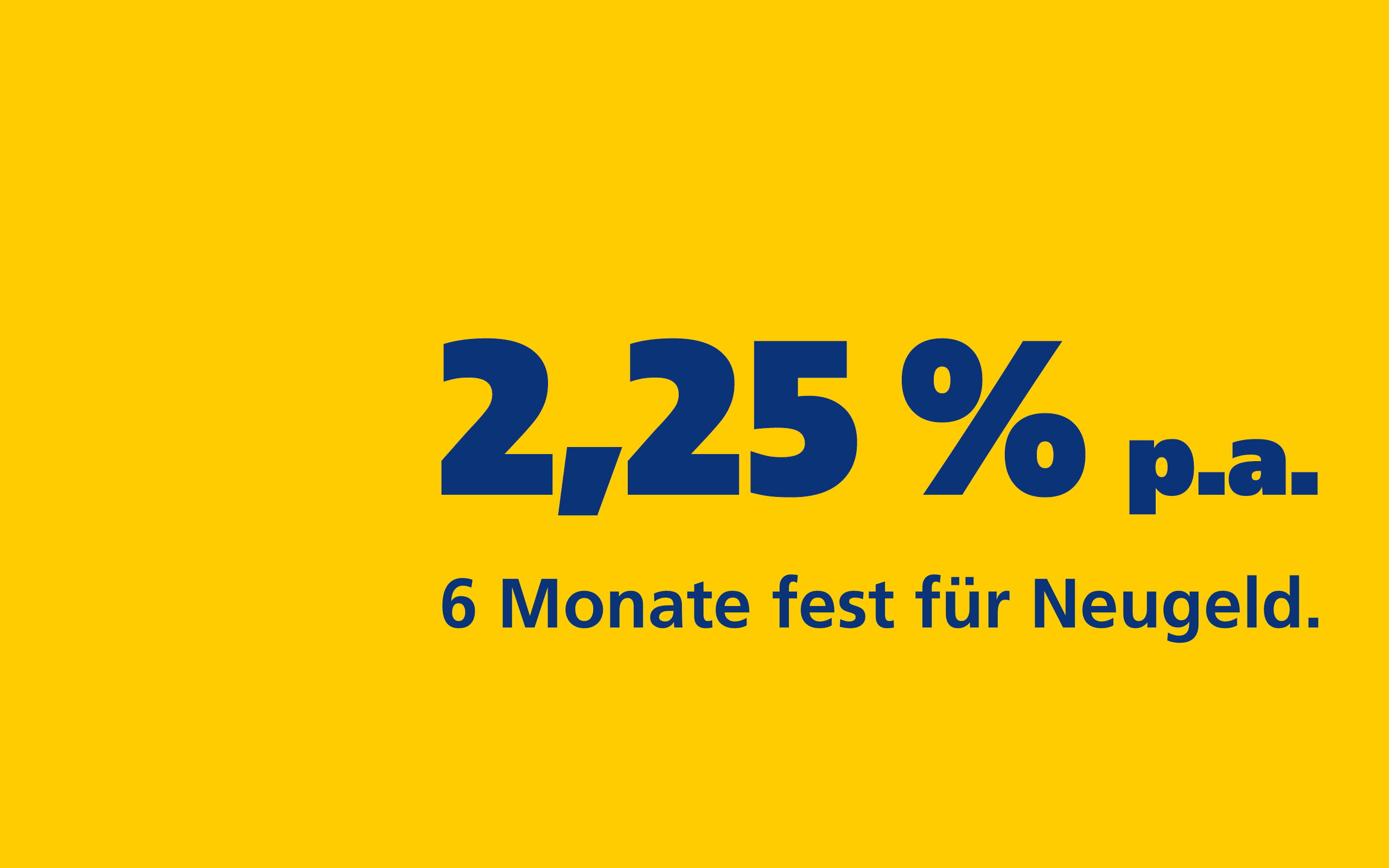 Tagesgeld- Neugeld-Aktion mit 2,25 Prozent p. a. für 6 Monate.