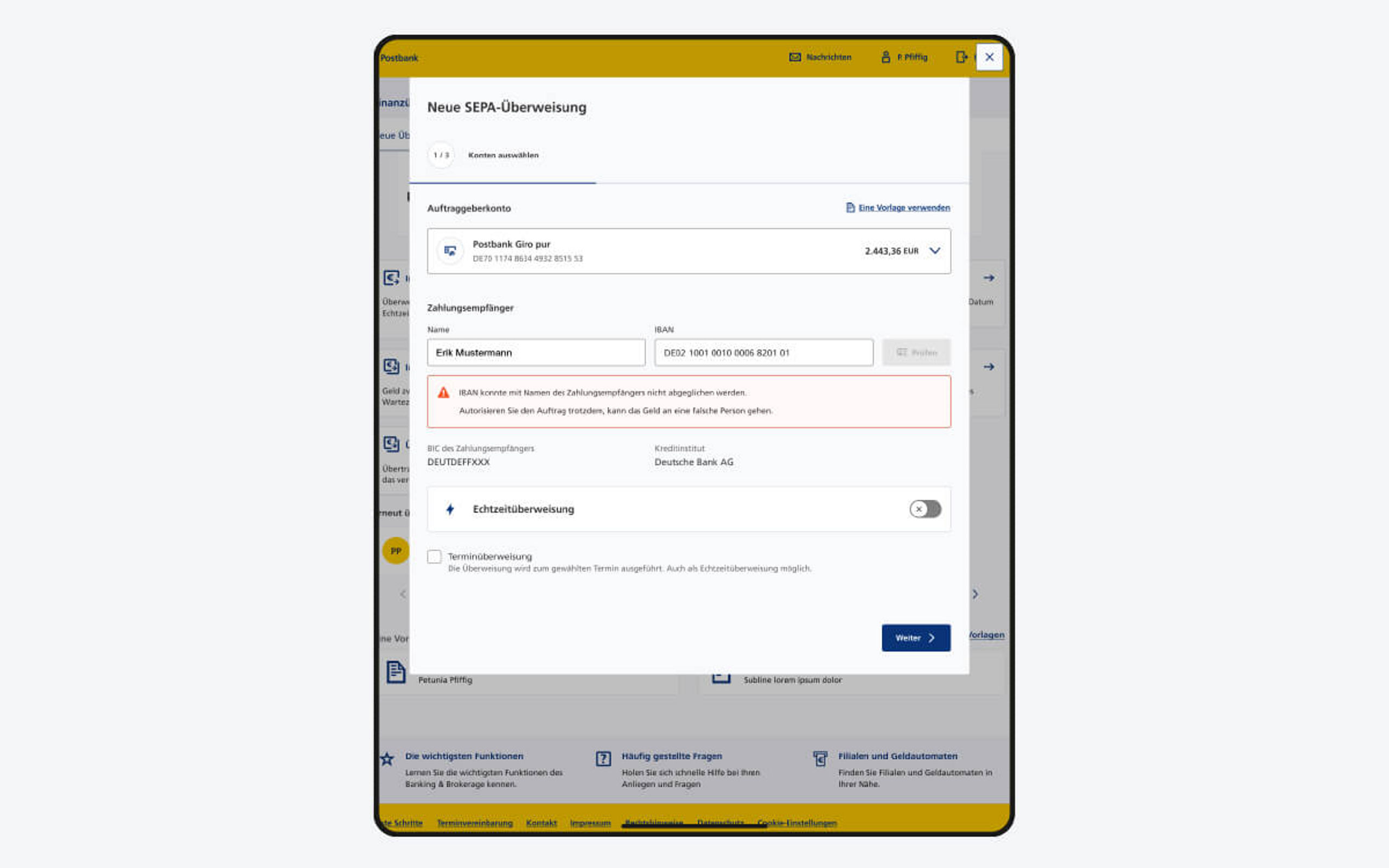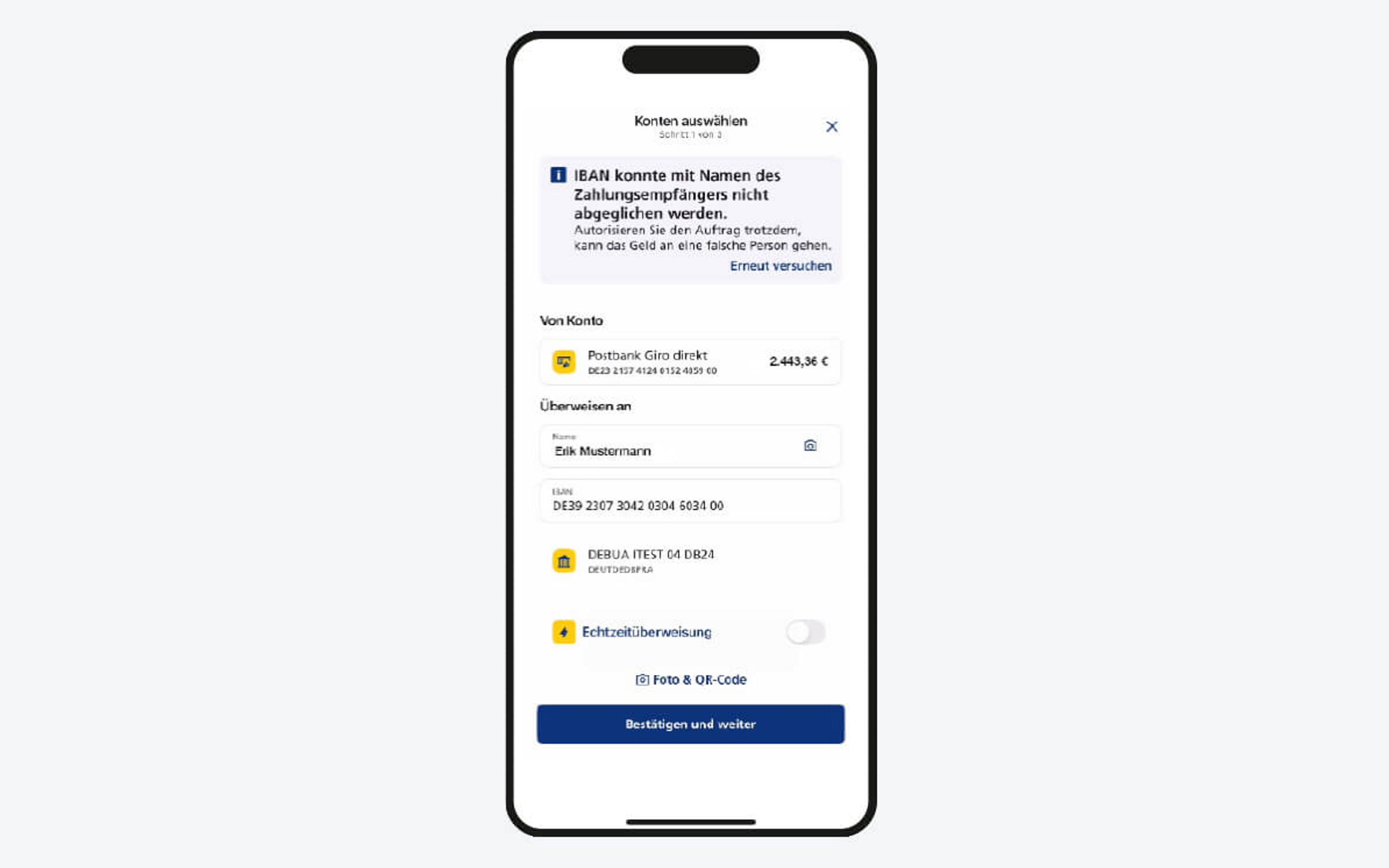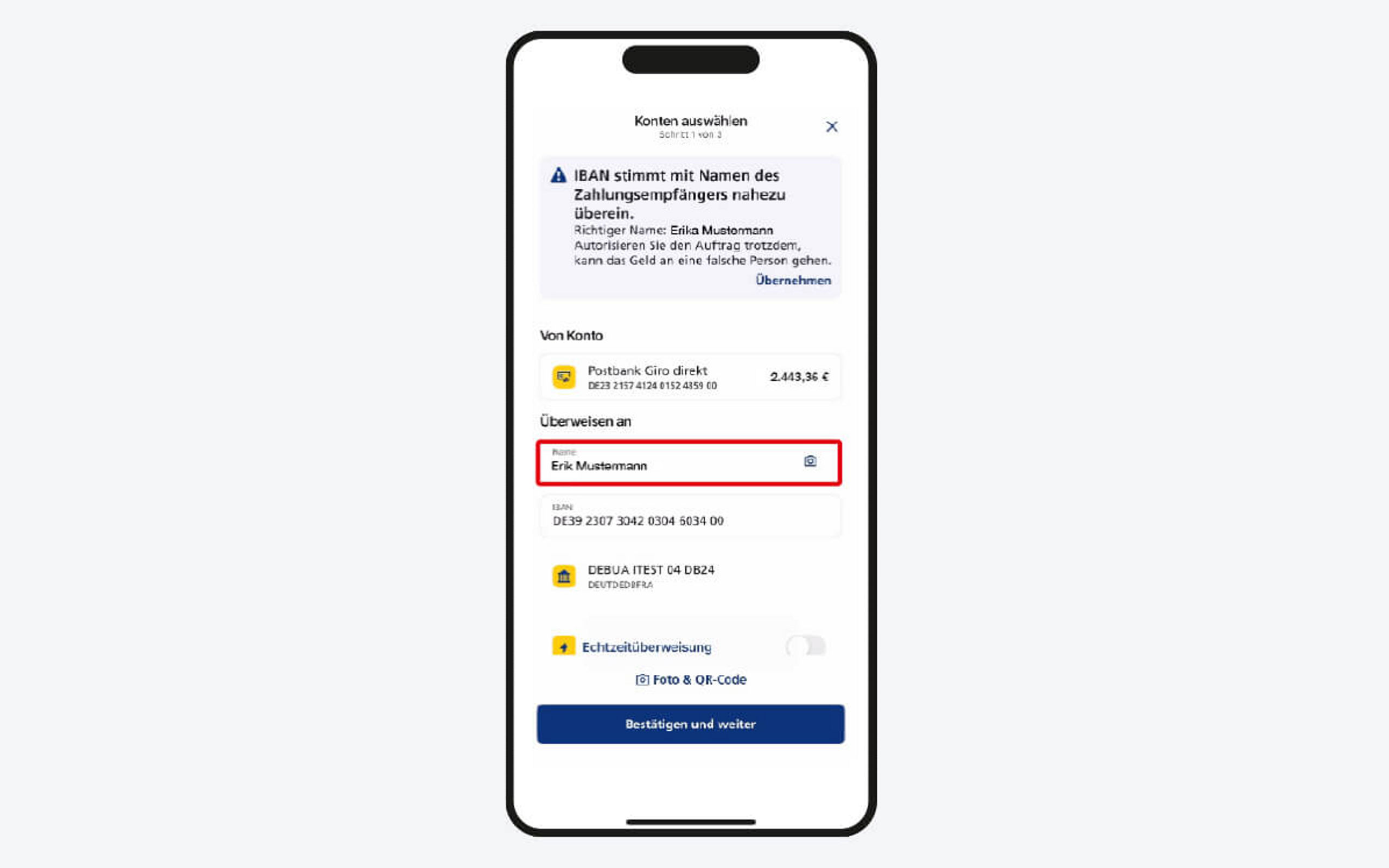 Die neue Verordnung verpflichtet Zahlungsdienstleister seit dem 9. Oktober 2025, vor der Ausführung einer SEPA-Überweisung oder einer SEPA-Echtzeitüberweisung eine Empfängerüberprüfung durchzuführen. Dabei werden die IBAN und der Name des Empfängers zur Überprüfung an die Empfängerbank weitergeleitet und abgeglichen. Nach Erhalt stellen wir Ihnen das Feedback innerhalb des Zahlungsvorgangs zur Verfügung und Sie entscheiden, ob Sie den Auftrag freigegeben oder ablehnen möchten.