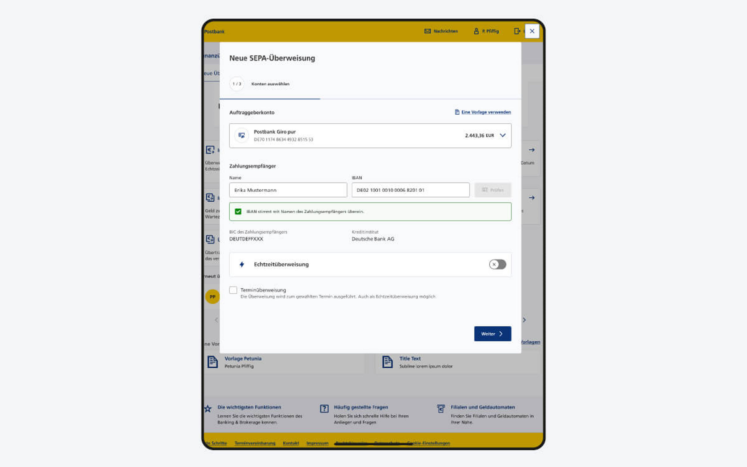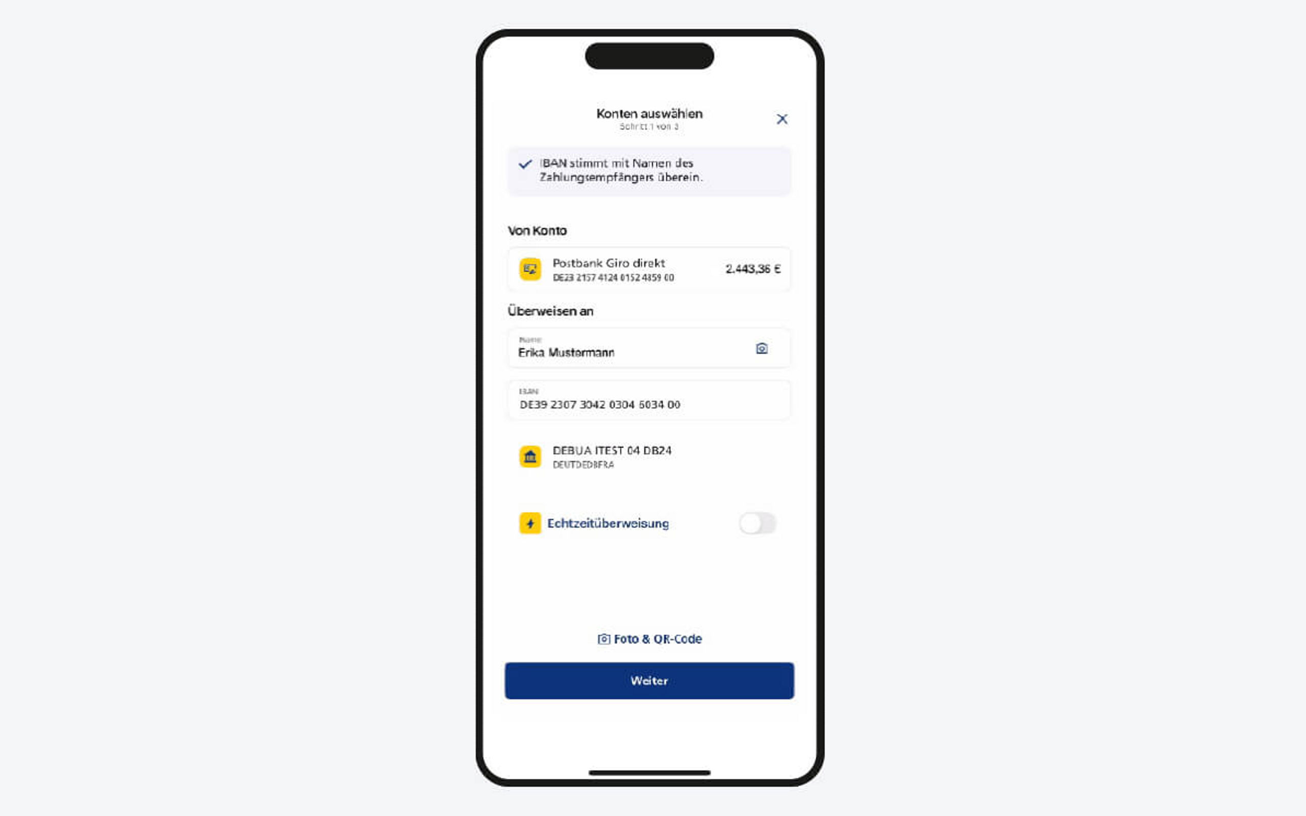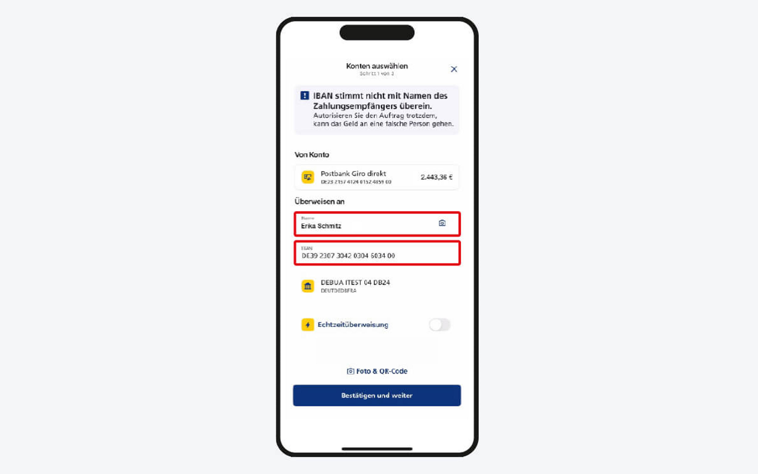 Die neue Verordnung verpflichtet Zahlungsdienstleister seit dem 9. Oktober 2025, vor der Ausführung einer SEPA-Überweisung oder einer SEPA-Echtzeitüberweisung eine Empfängerüberprüfung durchzuführen. Dabei werden die IBAN und der Name des Empfängers zur Überprüfung an die Empfängerbank weitergeleitet und abgeglichen. Nach Erhalt stellen wir Ihnen das Feedback innerhalb des Zahlungsvorgangs zur Verfügung und Sie entscheiden, ob Sie den Auftrag freigegeben oder ablehnen möchten.