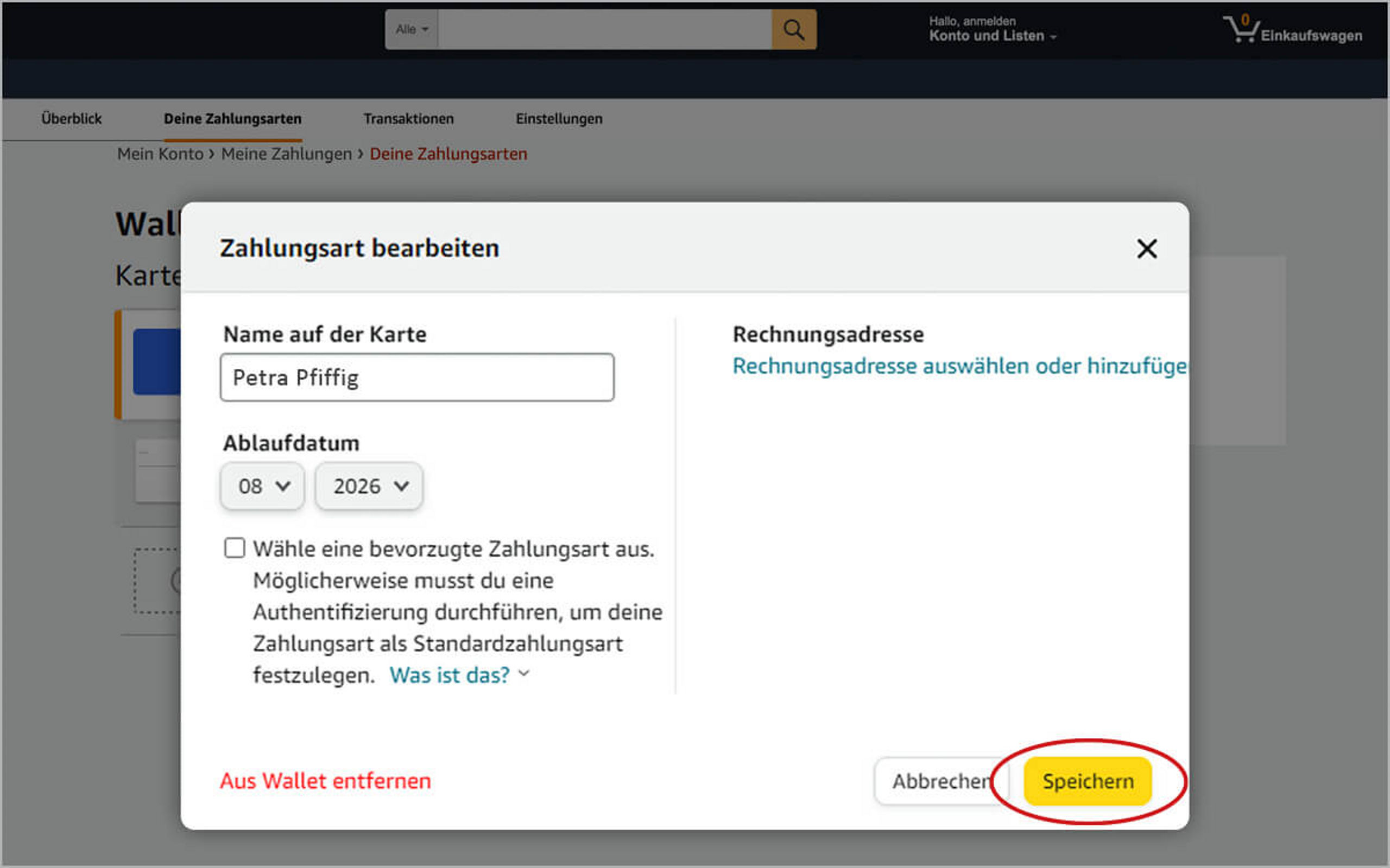 Löschen Sie zuerst unter „Zahlungsmethoden“ Ihre alte Kreditkarte.