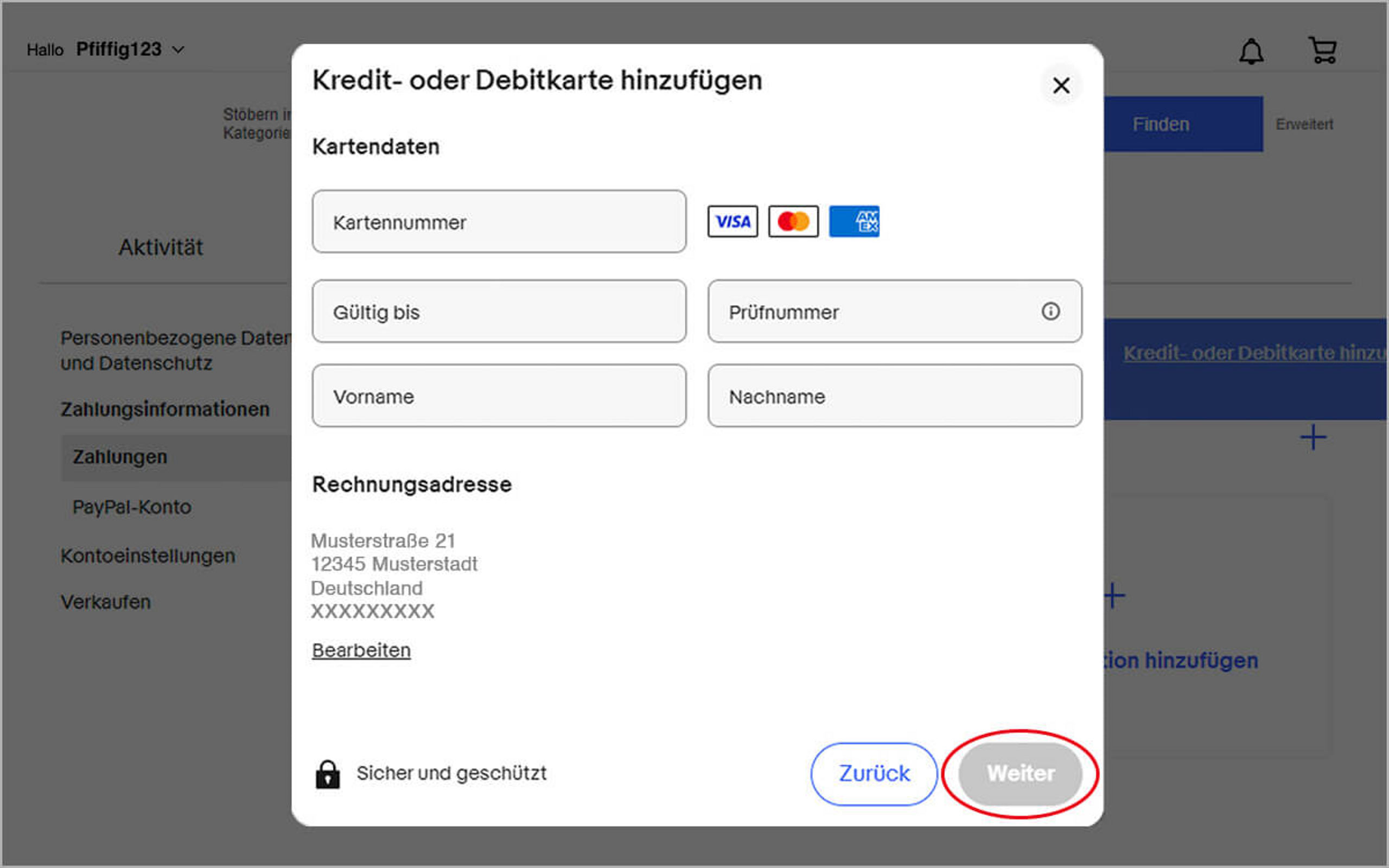 Füllen Sie jetzt bitte alle Felder aus und klicken Sie auf „Weiter“. Sie haben nun Ihre neue Postbank Mastercard erfolgreich bei eBay hinterlegt.