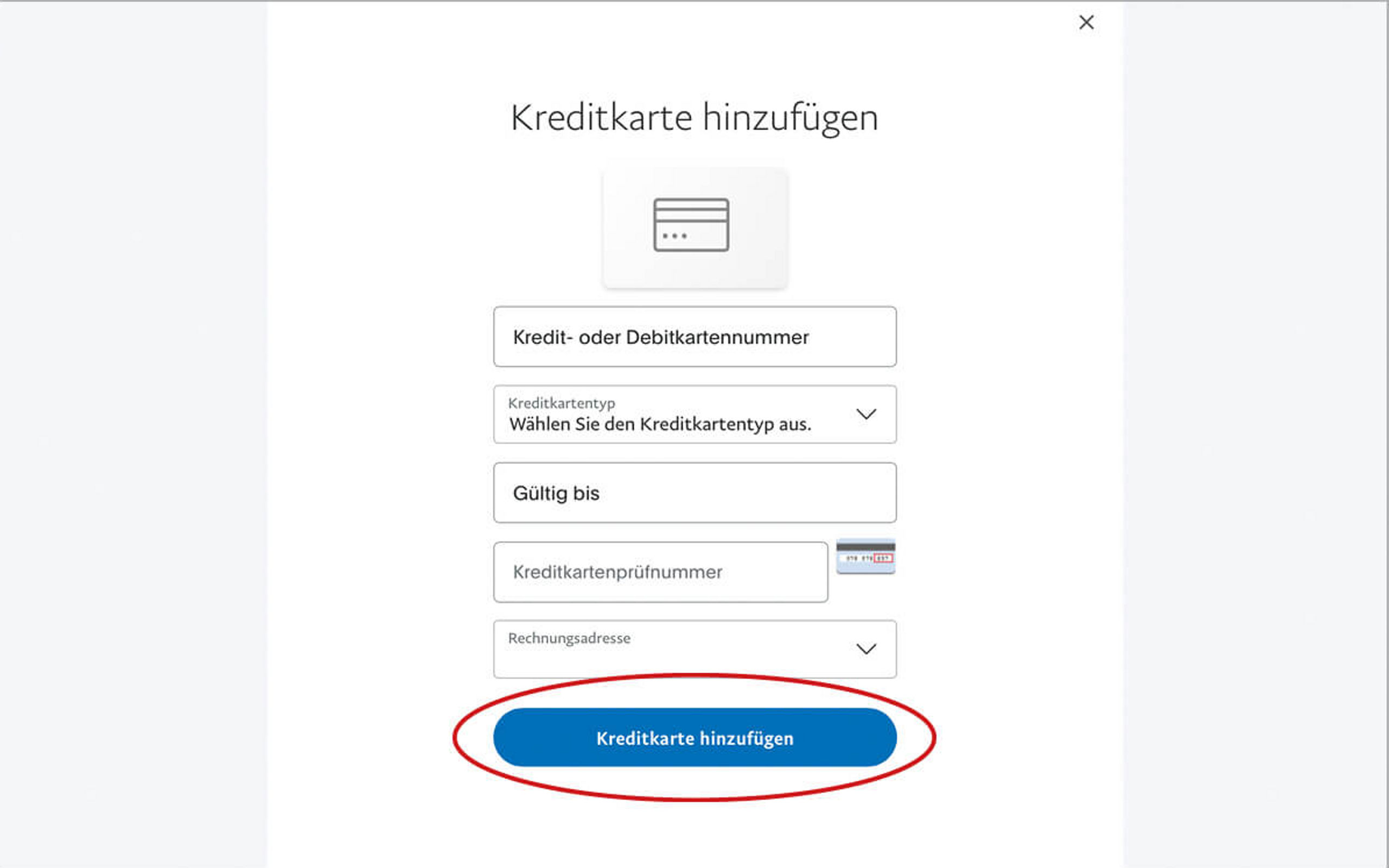 Über „Kreditkarte hinzufügen“ können Sie Ihre neue Postbank Mastercard als neue Zahlungsart hinterlegen. Füllen Sie anschließend bitte alle Felder aus. Vergessen Sie nicht, Ihre Daten zu speichern. Sie haben nun Ihre neue Postbank Mastercard erfolgreich bei Paypal hinterlegt.