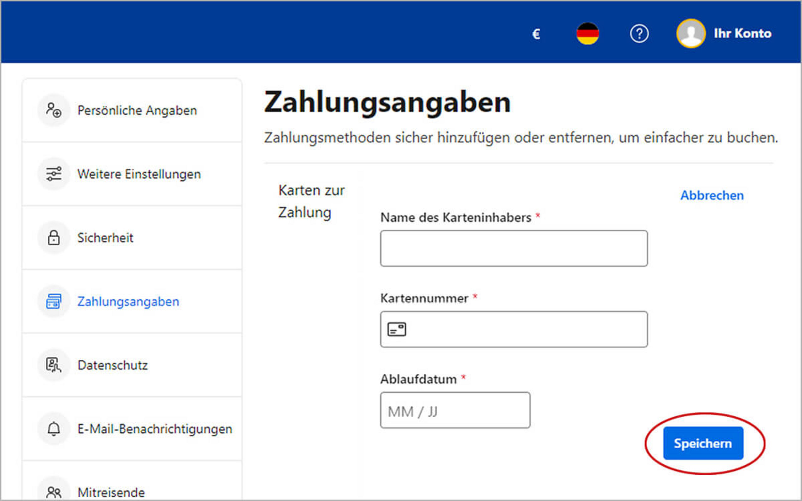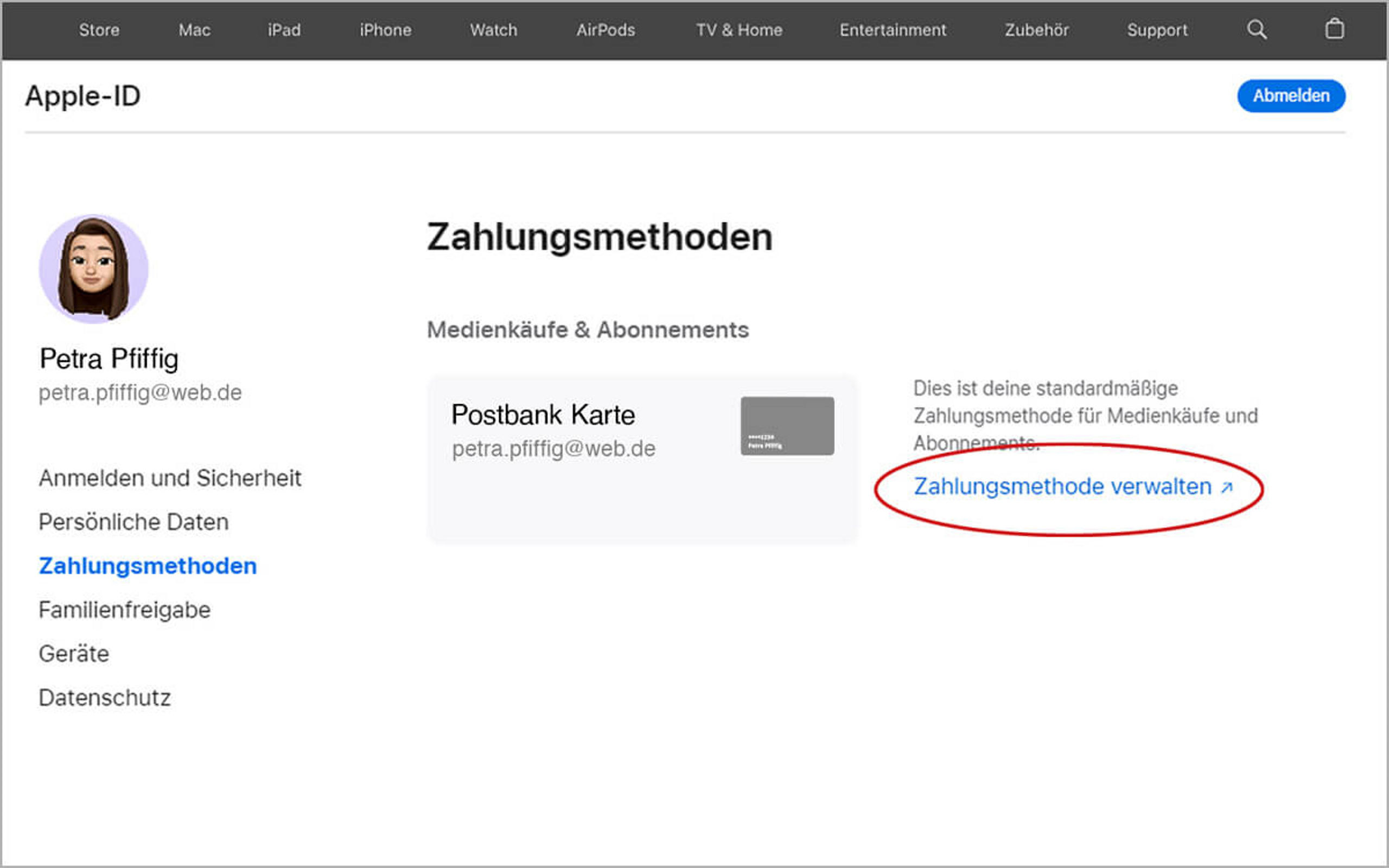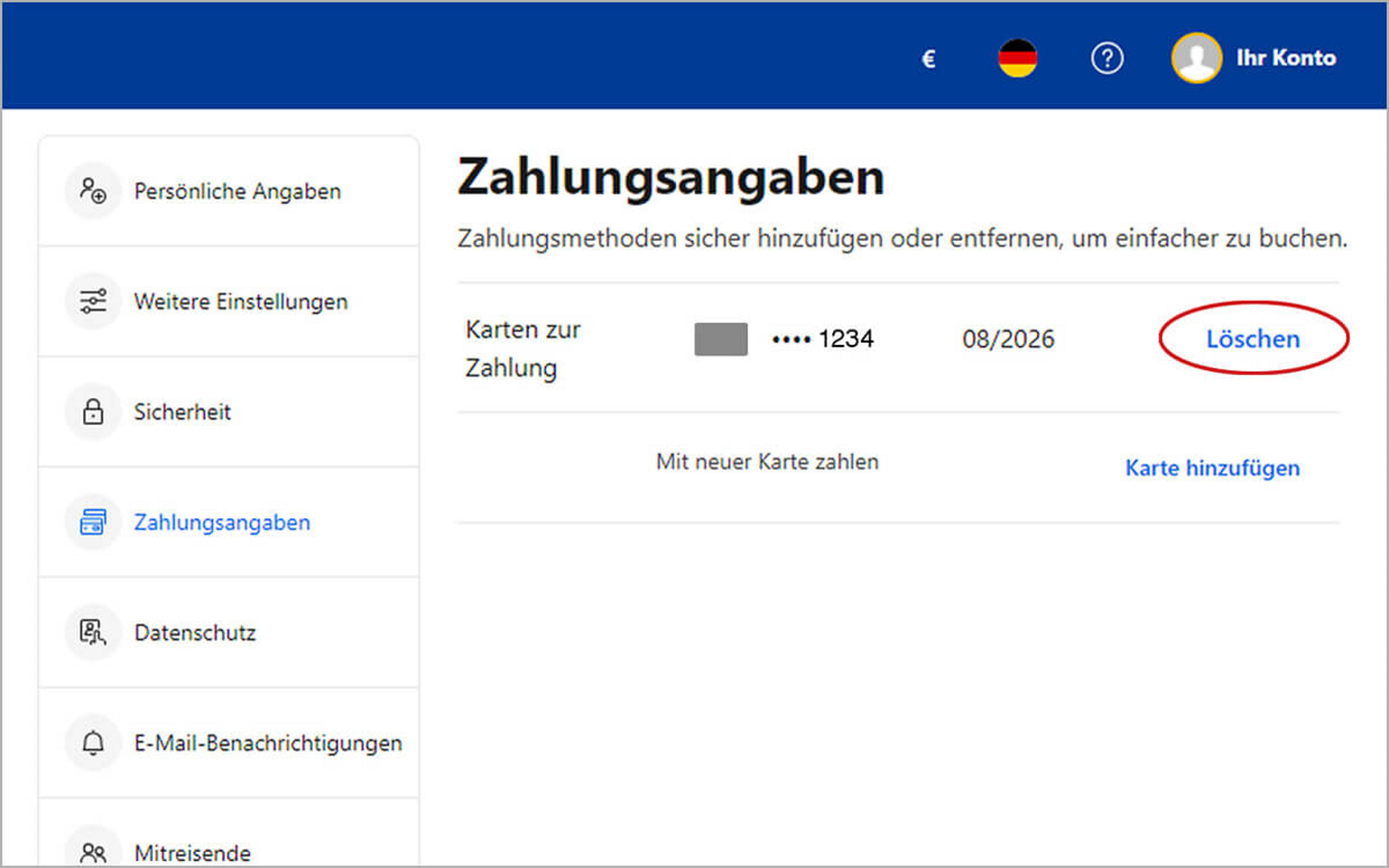 Hier können Sie sich auf Ihrem Profil Ihre hinterlegte Zahlungsmethode anzeigen lassen. Wählen Sie dazu unter „Konto verwalten“ den Punkt „Zahlungsangaben“. Sie können nun Ihre alte Postbank Kreditkarte löschen.