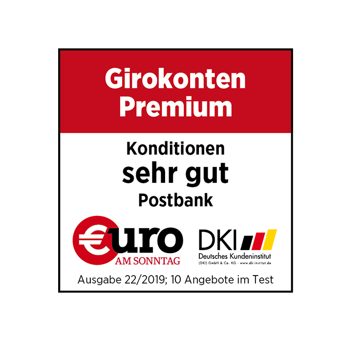 Im Test Premium Girokonten von €uro am Sonntag wurden die Konditionen des Postbank Giro extra plus mit sehr gut bewertet. Hierzu untersuchte das Deutsche Kundeninstitut die Kosten von zehn Premium Girokonten. Der Artikel dazu ist am 01. Juni 2019 in der Ausgabe 22 von €uro am Sonntag erschienen.