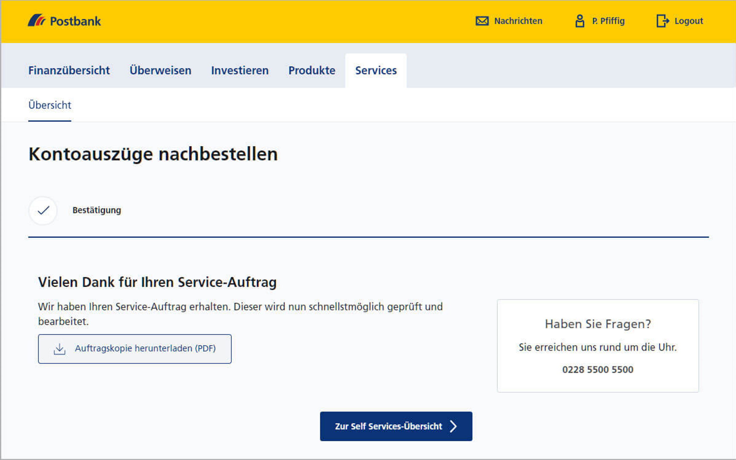 Wenn Ihnen Kontoauszüge fehlen, können Sie im Postbank Online-Banking oder im Postbank Service-Portal Duplikate bestellen. Wir zeigen Ihnen, wie es geht. Für die Nachbestellung fällt ein Entgelt an. Sie nutzen unser Online-Banking und haben das digitale Postfach aktiviert? Hier finden Sie alle Kontoauszüge im PDF-Format, die Sie seit Aktivierung des Postfachs erhalten haben.