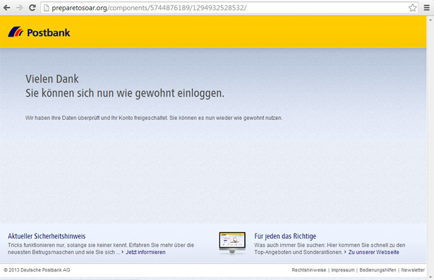 Hier werden Sie gebeten sich im Postbank Online-Banking anzumelden. Geben Sie auf dieser gefälschten Seite Ihre persönlichen Zugangsdaten zum Postbank Online-Banking ein, werden diese an die Betrüger übermittelt. Anschließend werden Sie wiederum auf eine gefälschte Seite weitergeleitet.