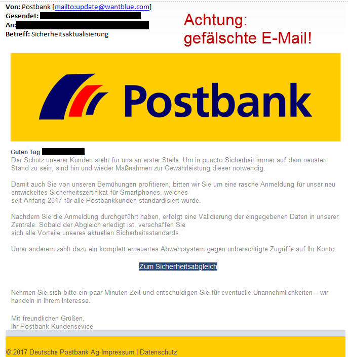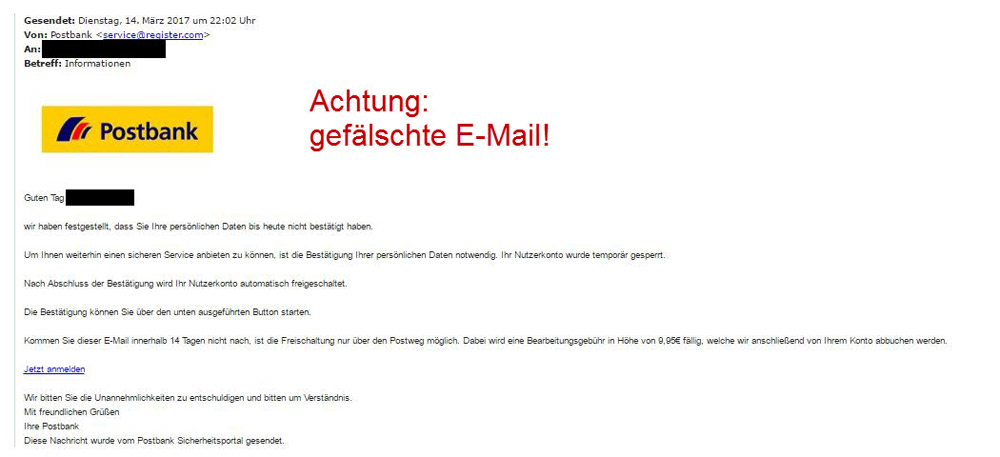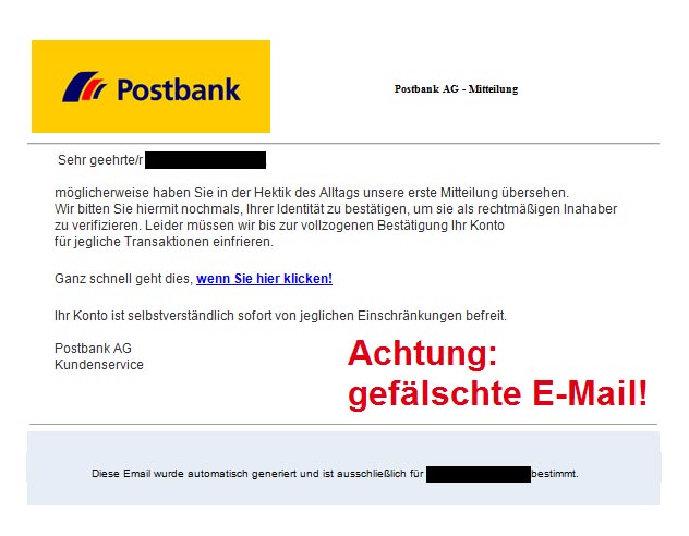 Mit diesen E-Mails werden Sie in betrügerischer Absicht auf eine gefälschte Online-Banking-Seite gelockt, die wie eine Postbank Online-Banking-Seite aussieht. Sobald Sie sich dort mit Ihrer Kontonummer und Ihrer PIN einloggen, kennen die Täter Ihre Zugangsdaten!