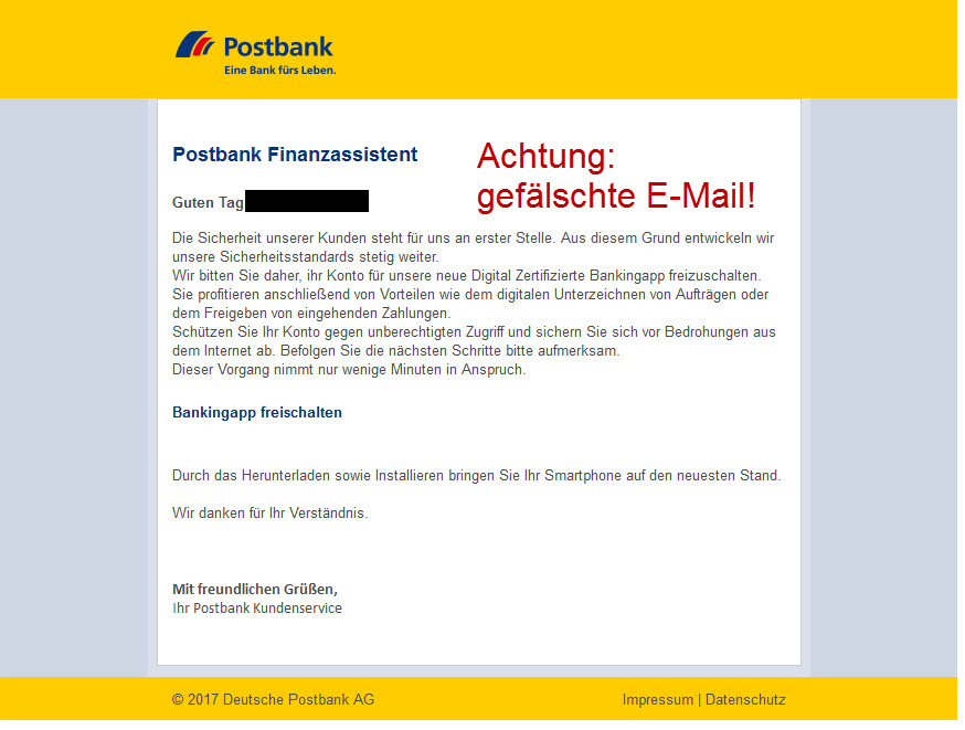 - Echte E-Mails der Postbank können Sie zudem durch eine E-Mail-Signatur von gefälschten unterscheiden. Mehr zur E-Mail-Signatur erfahren Sie hier: www.postbank.de/email-signatur