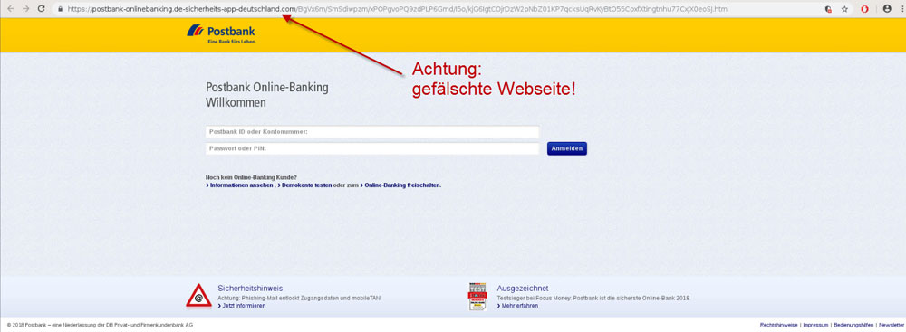 Durch Klicken auf den Link werden Sie auf eine Seite geleitet, die der Anmeldeseite des Postbank Online-Bankings zum Verwechseln ähnlich sieht.