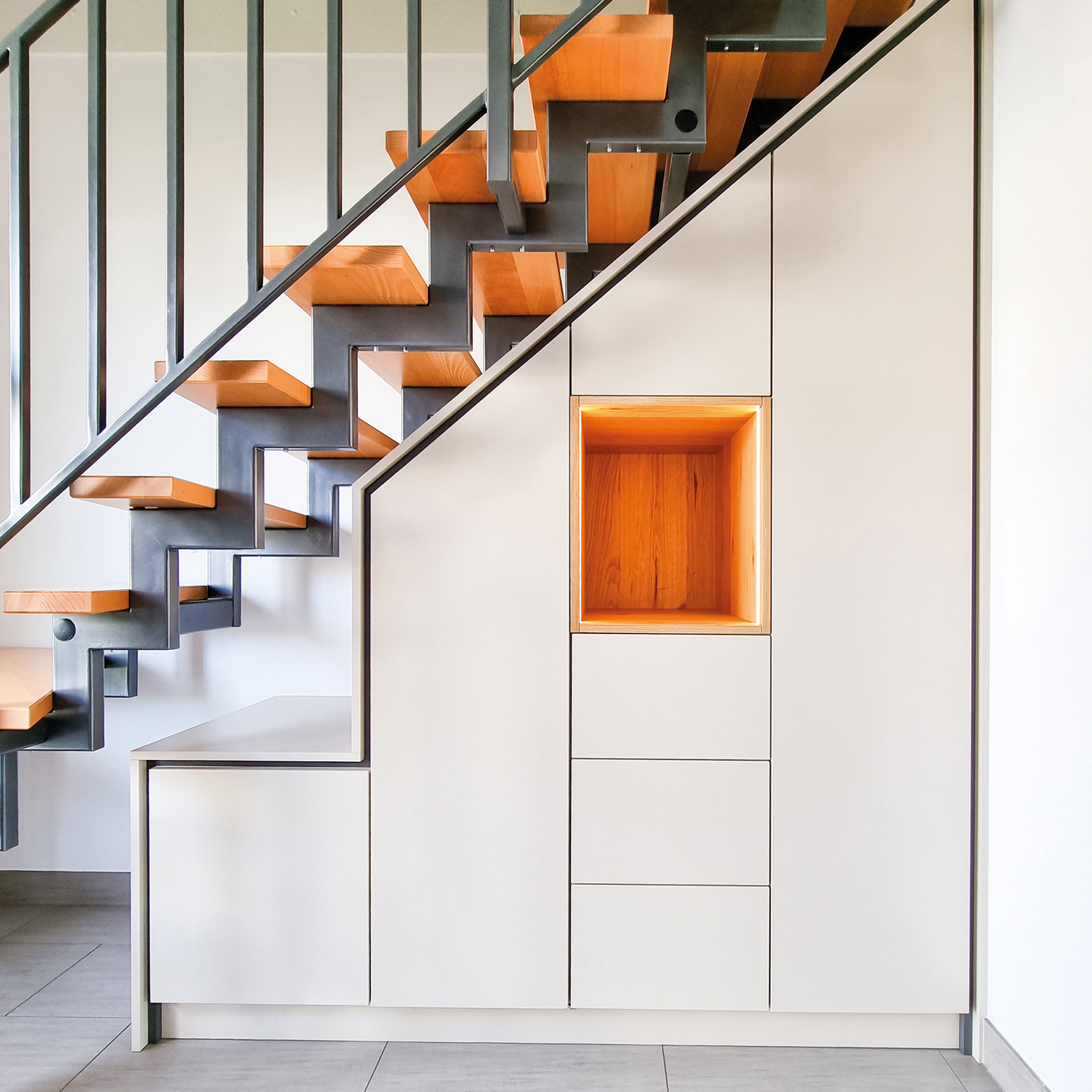 Treppen und Podeste schaffen da Platz, wo vorher keiner war. Schubläden oder Fächer können in die Stufen einer Treppe integriert werden, in denen dann Spielsachen oder Kleidung verschwinden. Ein Podest im Zimmer wird zur erhöhten zweiten Spielebene, ebenfalls mit praktischem Stauraum darunter.
