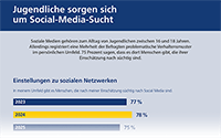 Jugendliche setzen sich zunehmend kritisch mit der Social-Media-Nutzung auseinander. Drei Viertel der 16- bis 18-Jährigen haben in ihrem persönlichen Umfeld Freunde, die sie für süchtig nach sozialen Medien halten. Junge Frauen (82 Prozent) nehmen diese Gefahr deutlich stärker wahr als junge Männer (68 Prozent).