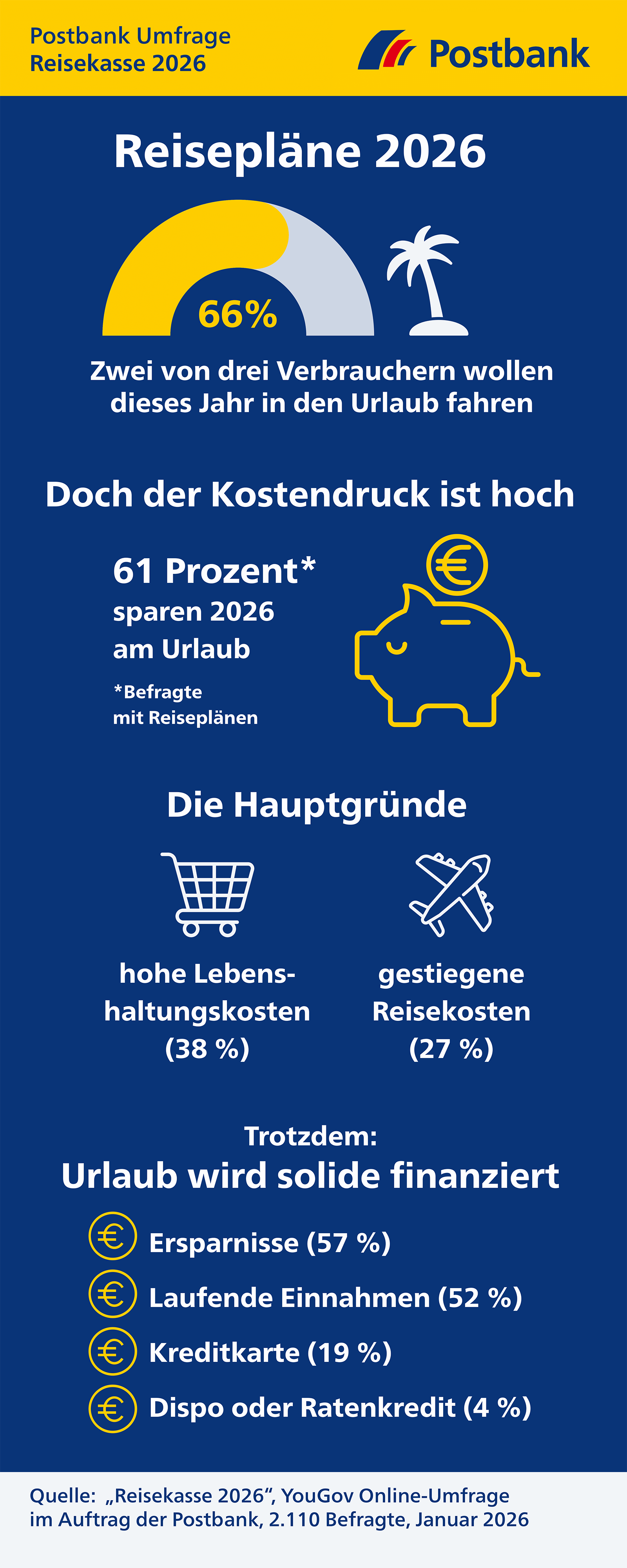 „Reisekasse 2026“, YouGov, Online-Umfrage, 2.110 Personen (davon 1.399 Befragte mit Urlaubsplänen für dieses Jahr), bevölkerungsrepräsentativ, Januar 2026.